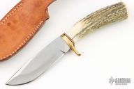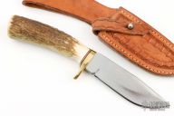 This knife features a satin finished blade with false top edge, .176" blade stock and 1.255" blade depth, hidden tang construction. The handle has a brass guard, stag grip and red/white/black spacers. Coems with a hand tooled brown leather sheath. Has a few light scratches, otherwise excellent condition.
