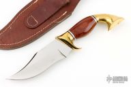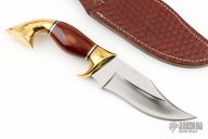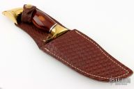 This Stinger Bowie from Iron Mountain Knife Company features a satin finished blade with false top edge, .185" blade stock, 1.738" blade depth, hidden tang construction. The handle has a brass guard and butt, a dymondwood grip black and aluminum spacers handle. This design - which allows you to retain the knife with your hand open/fingers splayed - was patented by Sonny Guiler in 1980 and the knife has the patent number stamped on the blade. Excellent condition. Includes brown leather sheath with belt loop.