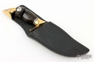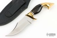 This Stinger Bowie from Iron Mountain Knife Company features a satin finished blade with false top edge, .185" blade stock, 1.738" blade depth, hidden tang construction. The handle has a brass guard and butt, a dymondwood grip black and aluminum spacers handle. This design - which allows you to retain the knife with your hand open/fingers splayed - was patented by Sonny Guiler in 1980 and the knife has the patent number stamped on the blade. Excellent condition. Includes brown leather sheath with belt loop.