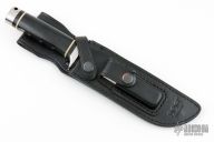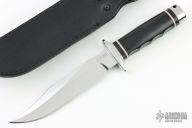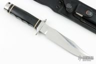 This Navy Seal Trident by SOG has a satin finished stainless steel clip point blade with false top edge, stainless guard and butt, and hidden tang. .222" blade stock, 1.214" depth. Handle has a stainless steel guard and butt with a stacked black paper micarta grip with white spacers. Comes with a original black leather sheath. Has a couple light scratches, otherwise excellent condition.
