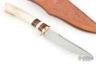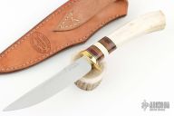 This hunter by RL Welling features a mirror finished blade with false top edge, .210" blade stock and .835" blade depth, hidden tang construction. The handle has a brass guard, stag grip with black/red/brass/micarta spacers. Comes with a hand tooled brown leather sheath. Has some light patina, otherwise excellent condition.