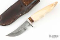This knife by Tim Tabor features a Damascus blade with .119" blade stock and 1.034" blade depth, hidden tang construction. The handle has a nickel silver guard, African hippo tooth grip and red/white/blue/amber spacers. Comes with a hand tooled brown leather sheath. Excellent condition.