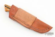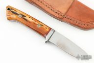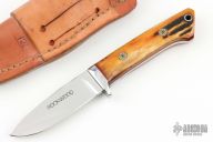 This knife by Rick Rockwood features a mirror polished blade with .127" blade stock and .910" blade depth, full tang construction. The handle has a stainless steel guard, stag scales with red liners and mosaic pins. Comes with a brown leather sheath. #121 on tang and sheath. Has a couple light scratches, otherwise excellent condition.