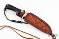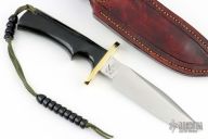 This HALO by Blackjack Knives features a satin finished clip point blade with false top edge, .213" blade stock and 1.215" depth, hidden tang construction. The handle has a brass guard, black paper micarta grip with lanyard hole. Comes with a brown leather sheath. Has some light spots on the blade, otherwise excellent condition. Comes with original box.