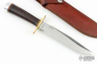 This Model 1-7 by Blackjack Knives features a satin finished blade with a false top edge, .204" black stock and 1.174" blade depth, hidden tang construction. The handle has a brass guard, stacked leather grip with red/white/black spacers, aluminum butt. Comes with brown leather sheath. Has some light scratches, otherwise good condition. Comes with origianl box.