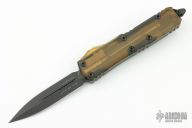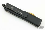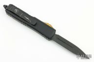 This UTX-85 OTF automatic by Microtech knives features a D/E DLC double-edged blade with a standard edge, and a black aluminum handle with Ultem scale, button, DLC hardware, tip down carry. Glass breaker. Dated 07/2023. Comes with original box and papers. Excellent condition.