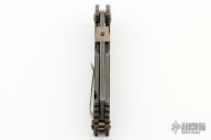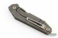 This QSE-9 Mr. Strickland from Quartermaster features a multi-ground tanto blade with thumb disk. The handle has a custom finished and laser engraved titanium frame with stonewashed tip up clip. Includes original box and papers. This knife has been customized by "Way of Knife", custom blade finish, custom bark finished handle with laser engraving. Has been resharpened, has a few light scuffs, otherwise excellent condition.