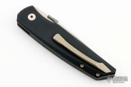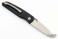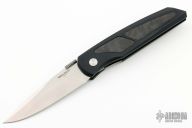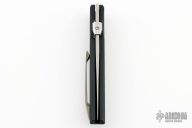 This D/A Harkins ATAC has a satin plain edge blade that has a thumbdisc and false top edge. The handle has a black aluminum frame with carbon fiber inlays, one of which is a hidden button to fire the knife. Tip up orange peel finished titanium clip. Comes with original box and papers. Excellent condition.