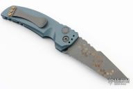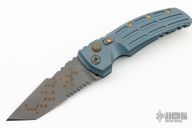 This EX-A01 by Hogue Knives is an Allen Elishewitz design, it features a gray/gold tanto partially serrated 154CM blade with notched thumbrest. The handle is blue aluminum, tip up or down reversible stainless steel clip. Has safety. Comes with Hogue box, soft pouch, and papers. Professionally cerakote finished, new in box.