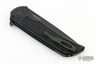 This Mordax by Pro-Tech is a Ferrum Forge design and features a black drop point blade with flipper. The handle has milled black aluminum frame with black tip up stainless steel clip. Mosaic pin inlaid push button. Comes with original box and papers. Excellent condition.