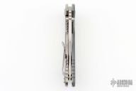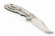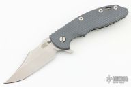 This XM-18 Flipper by Rick Hinderer Knives features a 3.5" stonewash finish blade, notched thumbrest and flipper, dual thumbstuds. The handle has a grey G-10 scale, and stonewashed titanium handle and satin finished hardware, filler tab, and titanium clip. Clip can be mounted for tip up or down carry. Nice lockup, seating, and detent. Comes with original box and extra hardware. Excellent condition.