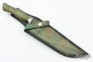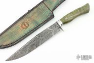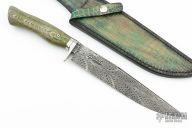This Fighter by Abril Knives features a Feather Damascus blade with false top edge, .146" blade stock and 1.406" blade depth, hidden tang construction. The handle has a satin polished guard, and wood grip with single stainless pin. Comes with hand-tooled leather sheath. Excellent work. New from maker!