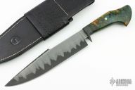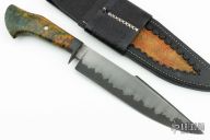 This Fighter by Abril Knives features a San Mai blade ( forged inox 420/1070) with false top edge, .187" blade stock and 1.948" blade depth, hidden tang construction. The handle has an iron guard, and stabilized maple burl wood grip with single mosaic pin. Comes with hand-tooled leather sheath and frog. Excellent work. New from maker!