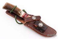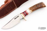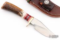 The miniature Model 27 debuted in Randall's 2012 75th anniversary catalog and is the first catalog miniature model. This knife has a satin finished stainless steel blade with notched thumbrest, .189" blade stock and 1.248" blade depth, hidden tang construction. The handle has a brass guard and butt plate, and a stag handle with red, brass, white, red linen micarta, black and duralumin spacers. Comes with a brown leather sheath with miniature stone. Comes with original paper wrapping. New from maker.