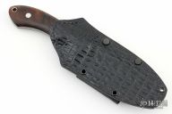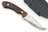 This Personal Carry by Burt Foster features a laminated blade with 420 stainless outer and 1095 inner, .142" blade stock and .983" blade depth, full tapered tang construction. The handle has walnut scales with beaded lanyard. Comes with a black leather sheath with belt loop. Comes with original box. Has a couple scratches, otherwise good condition.