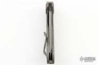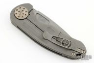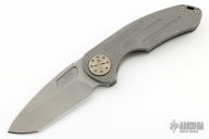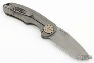 This F3 by Curtiss Knives features a stonewashed blade with notched thumbrest. The handle has a tumbled titanium frame with Ball Mill pattern, a matching tip up titanium clip. Titanium hardware. Rides on bearings, nice detent and lockup.  Comes with original box, zipper case, COA, patch and sticker pack. New condition.