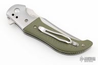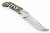 This Boker Plus Uolcos folding knife embraces the Persian style as intended by designer Raimund Lhotak from Austria. The Uolcos features a two-tone 440C stainless steel trailing point blade with satin faces and stonewashed grinds. The sleek ergonomic handle has steel liners and tumbled bolsters along with green G-10 scales. The liners also have two patches of recessed grooves as a nice touch. Comes with original box. Excellent condtion. #0399