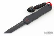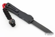 This Manticore-E by Heretic Knives features a black tanto blade with notched thumbrest. The handle has a black aluminum frame, black stainless steel hardware and tip down clip, and DLC titanium thumbslide. Comes with original box and papers. Comes with a cobalt bead. Has some light scuffs, and scratches, great condition otherwise.