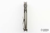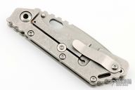 This Mick Strider Performance Series SMF framelock folder features a spear point blade with thumbhole and notched thumbrest. The handle has a stonewashed titanium frame with titanium clip, tip up carry. Jimping on blade spine. Includes Hinderer "Lock Bar Stabilizer" for maximum reverse lock retention. Nice detent, lockup and blade seating. Excellent condition.