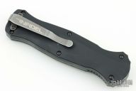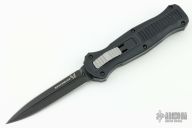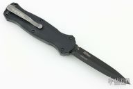 "Introducing an OTF like none-other.. The new Infidel® is rapidly making believers out of many a skeptic. Built for strength and reliability the patent pending double-action mechanics get it done over the long haul. Grab on and you will find the handle grip rock-solid with its patented machined in Presidio® style bi-directional tread pattern, and overall generous sizing for gloved hands. Intuitively pressure the release-slide forward and its spear-point edged steel fires and locks up with a unique three-point retention system with amazingly negligible blade play. Reverse the process and the blade retracts in a rapid blur of motion. The Benchmade Infidel is a special operator’s fantasy come true." Has some scuffs and minor wear, otherwise good condition. Comes with original sheath.