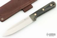 This Gen 5 by LT Wright features a satin finished saber ground blade with .124" blade stock and 1.225" blade depth, full tang construction. The handle has black canvas micarta scales. Comes with original box and brown leather sheath. Excellent condition.