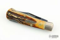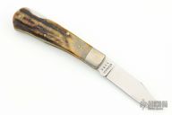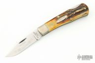 This Ka-Bar Lockback has a mirror polished blade with nail nick. The handle has nickel silver bolsters, stag scales, brass liners, and stainless steel spring. Has some light scratches, otherwise excellent condition. #0509. Comes with original box and original order form dated 1979.