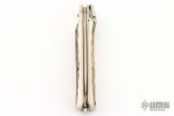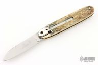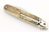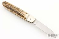 This Lever Lock Automatic by Hubertus Knives features a polished drop point blade. The handle is comprised of nickel silver bolster and lever with stag scales over brass liners and steel backspacer. Has some light scratches, otherwise excellent condition.