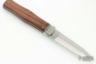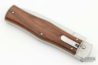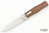 This lever auto from Mikov Knives has a polished and stonewashed spear point blade with false top edge. The handle has polished stainless steel bolsters and liners, and dark wood scales. Action is smooth and strong. Excellent condition.