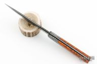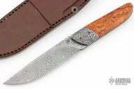 This one of a kind knife by Hennie Du Plessis features a carbon Damascus blade with ceramic balls inlaid in the spine as a thumbrest, .155" blade stock and .975" blade depth, full tang construction. The handle has Mosaic Damascus dovetailed bolsters by Mastersmith Heather Harvey, poplar burl wood scales. Comes with a hand tooled brown leather sheath, zippered case and COA. Excellent condition.