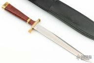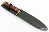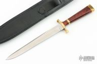 This Speed Fighter from Dan Harrison features a satin finish spear point blade with sharpened top edge, .152" blade stock and .890" blade depth over hidden tang construction. The handle is comprised of a brass guard and pommel with brass spacer and Amboyna burl wood grip. Includes a black leather sheath with belt loop (Buck Knives Sheath, fits ok, not perfect). Excellent condition.