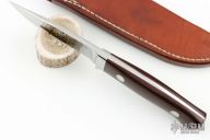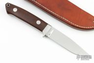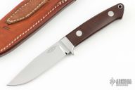 The 4" Utility by Bob Loveless features a mirror finished clip point blade with the "R.W. Loveless maker Riverside CA" logo. Full tapered tang construction. .184" Blade Stock .950" Blade Depth. The handle has a stainless steel guard and green canvas micarta scales with red liners, lanyard hole. #672. Comes with matching numbered leather sheath. Has a couple of very light scratches, otherwise excellent condition.
