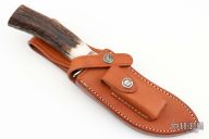 This Rick Bowles Hunter by Randall has a satin finished blade with false top edge and notched thumbrest, .208" blade stock and 1.459" blade depth, hidden tang construction. The knife carries the small Randall logo stamp and the backside is etched with "Bowles Hunter 005". The handle has a nickel silver guard, red/white/blue spacers, stag grip, compass in the butt and a scrimshawed paw print, scrimshaw by Rick Bowles that is #980. Comes with brown leather sheath and a Randall zippered case. Comes with original invoice dated 2/27/03. Excellent condition.