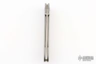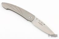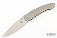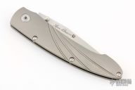 This Titan button lock folder by William Henry features a hand rub satin finished San Mai VG-10 core blade with dual thumbstuds. The handle has a bead blasted titanium frame. Comes with original box, sheath and COA. Has a couple light scuffs and scratches, otherwise excellent condition.
