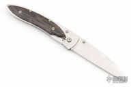 This Evolution framelock folder by William Henry features a satin finished blade, with knurled thumbstud. The handle is comprised of a satin finished stainless steel frame with cocobolo scales. Comes with original box and black leather pocket sheath. Has some light scuffs and scratches, otherwise great condition.