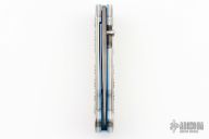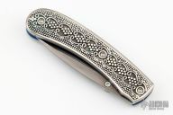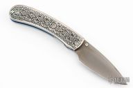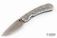 This T09LE2 has a boron carbide coated stainless steel spear point blade with single aquamarine inlaid thumbstud. The handle has a titanium frame with granulated sterling silver scales. Limited edition of 100. Comes with original box, papers, and leather sheath. Has a couple light scuffs, excellent condition otherwise.