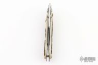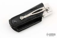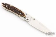 This framelock folder by William Henry features a satin finished blade, with knurled thumbstud. The handle is comprised of a satin finished stainless steel frame with stag scales. Comes with original box and black leather pocket sheath. Has some light scuffs and scratches, otherwise great condition.