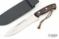 A serious and well designed tactical fixed blade from Mike Irie. The blade is hand rub satin finished. The top edge is sharpened 4 1/2 inches starting at the tip. 1/4 inch thick at the spine with a depth of 1 3/8 inches. Full tang construction with a raised file notched thumbrest. The handle has ebony dovetailed bolsters, desert ironwood scales with red liners and spacers. Firm, solid grip. Comes with black kydex sheath. Excellent condition.