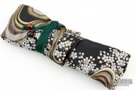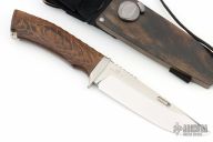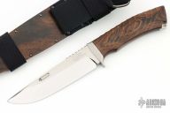 This KON by Rockstead features a mirror polished blade with a false top edge and notched thumbrest, .208" blade stock and 1.311" blade depth, hidden/mortise tang construction. The handle has stainless steel guard and lanyard hole, wood micarta grip. Comes with a wood and black nylon sheath with lock on the front. Comes with original silk bag and papers. Excellent condition. CRAZY SHARP!