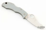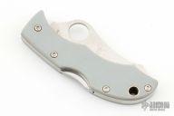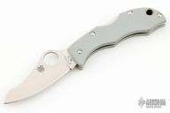 This Jester by Spyderco features a satin finished blade with thumbhole and notched thumbrest. The handle has grey G-10 scales, stainless steel liners and backspacer, lanyard hole. Comes with original box and papers. New condition.