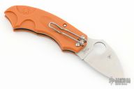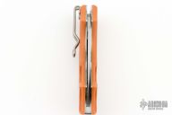 Set inside the handle is a Phantom Lock that has no visible unlocking mechanism. To unlock: Settle your thumb on the divot located on the end of the folder (over the bug). Push forward, moving the handle scale downward/forward a couple millimeters releasing the blade, easily done with one-hand. Along the underside of the handle a succession of angles form placement points for the hand and channel ergonomic grip into control over the cutting edge. Steel liners inside the FRN boost the lock's strength and a double as a plate for securing screws attaching the tip-down tension-wire clip. Shaped in a modified leaf pattern, the blade is hollow-ground laminated steel with a spine cusp for thumb traction.