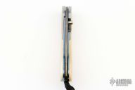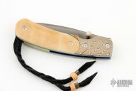 This T09 Kestrel has a boron carbide coated finished 154CM spear point blade with fossil walrus ivory inlaid thumbstud. Handle has mokume bolsters, fossil ivory inlays, anodized titanium liners , backspacer, and lanyard bail. Comes with original box, papers, and leather pouch. Has light scuffs and scratches, great condition otherwise.