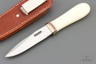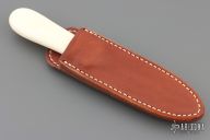 This Gambler by Randall Made Knives features a satin finished blade with .177" blade stock and .865" blade depth, hidden tang construction. Sharpened top edge. Notched thumbrest. Walrus ivory grip with brass guard, red/white/blue spacers. The Gambler is one of Randall's non-catalog knives. Brown leather sheath with boot clip. Excellent condition. Comes with a Randall zippered case.
