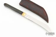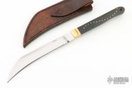 This Wharncliffe Fighter features a satin finished hawkbill blade with .280" blade stock and .912" blade depth, full tang construction. The handle has fluted brass bolsters, black canvas micarta scales with red liners, brass pins, lanyard hole in the butt. Comes with a brown leather sheath and zippered case. Excellent condition. #9511