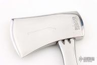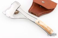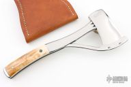 This No.2 Safety Axe by Marbles has been customized by Tom George. It has been mirror polished and has mammoth ivory grips. This "pocket axe" has a spring loaded safety guard that folds down into the handle.  Stamped size No. 2 on the axe head, and marked "Marble - Gladstone, Mich., USA". Comes with a custom brown leather sheath. Has an oxidation line on the blade, otherwise excellent condition.