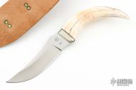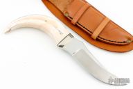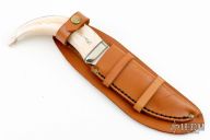 This knife by Pieter Viljoen features a hand rub satin finished blade with mirror polished flats, .171" blade stock and 1.320" blade depth, hidden tang construction. The handle has a nickel silver guard, warthog tusk grip with black/white spacers. Comes with a brown leather sheath. #432 on the blade. Excellent condition.