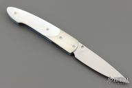 "The original classic William Henry's first design still going strong more than 10 years later. The Lancet defined, and continues to define, the essential gentleman's folder in the modern world. Sleek, elegant, refined, and comfortable in the hand and to the eye. Like many of our designs, the Lancet offers maximum flexibility and utility simply an exceptional daily carry tool, worthy of virtually any cutting task that comes along. Winner of multiple industry awards, in a variety of iterations over the years, the patterns shown here are all new limited edition offerings continuing the Lancet's legacy in fine cutlery." This T10P linerlock folder features a hand rub satin finished blade, nickel silver bolsters, anodized titanium liners, mother-of-pearl scales. Includes original box and paperwork. There are a couple light scratches on the frame, otherwise good condition.