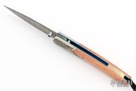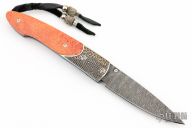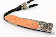 This lancet by William Henry Fine Knives features a Mike Norris Damascus blade, granulated sterling silver and 18K gold bolsters, and an apple coral handle. Sapphire inset in thumbstud. Comes with original box, papers, and leather sheath. Has some light scuffs, excellent condition.