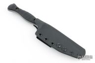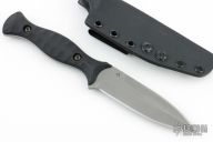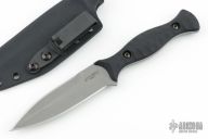 This Grinch by Kramer Custom Knives features a stonewashed doubled edged blade with notched thumbrest, .150" blade stock and 1.051" blade depth, full tang construction with black G10 scales. Comes with a kydex sheath. Excellent condition.