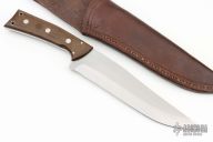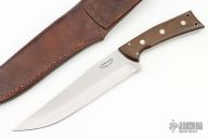 This Camp Knife by Alain Desaulniers features a high polished grinds and hand rub satin finished flats, .191" blade stock and 1.966" blade depth, full tang construction. The handle has green canvas micarta scales. Comes with a brown leather sheath. Has some light scratches, otherwise excellent condition. Comes with a hand written COA.