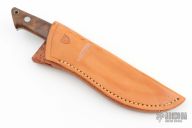 This Hunter by A. Desaulniers features a polished drop point blade with .210" blade stock and .984" blade depth, full tapered tang construction. The handle has a stainless steel guard and walnut scales with red liners. Lanyard tube in pommel. Includes leather sheath with belt loop. Has some oxidation on the blade near the guard, otherwise good condition.